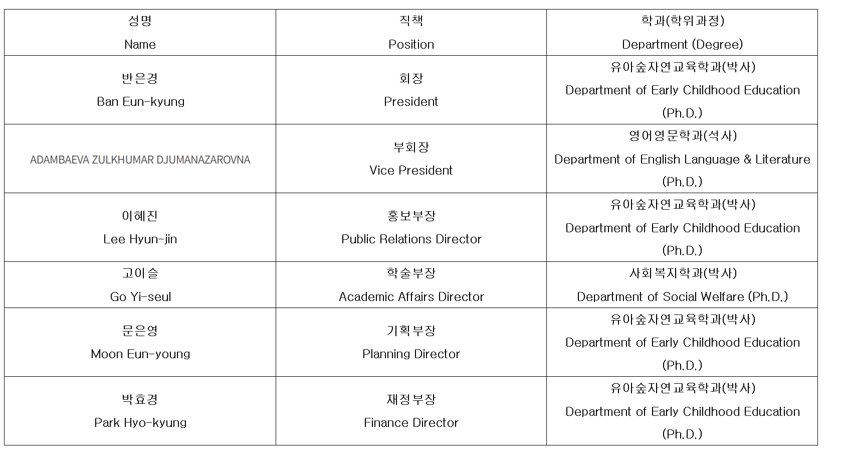 Student Council Contact Information (President: Ban Eun-kyung Email inquiries: kimlove4862@naver.com)